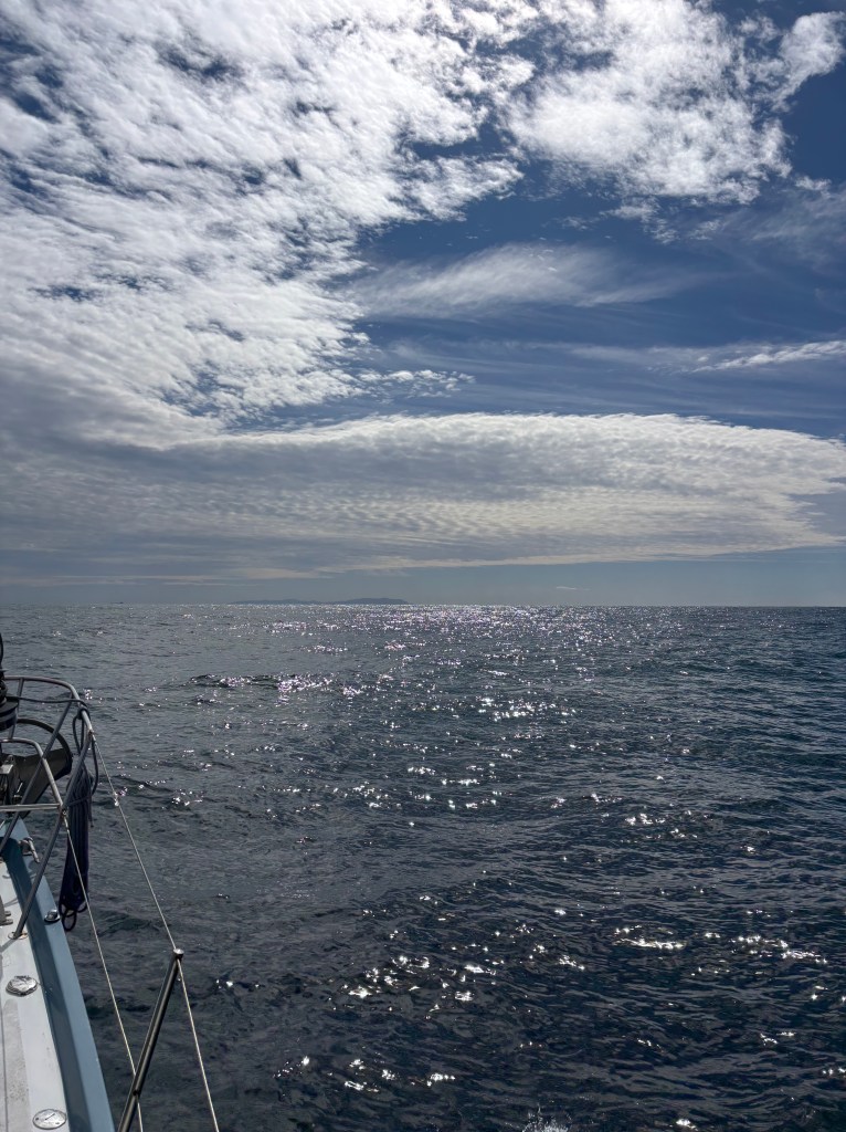 Well, nine hours of motoring to go (windless day), might as well have a sandwich. About Magu Rock we were joined by dolphins, who escorted us all the way to Catalina.